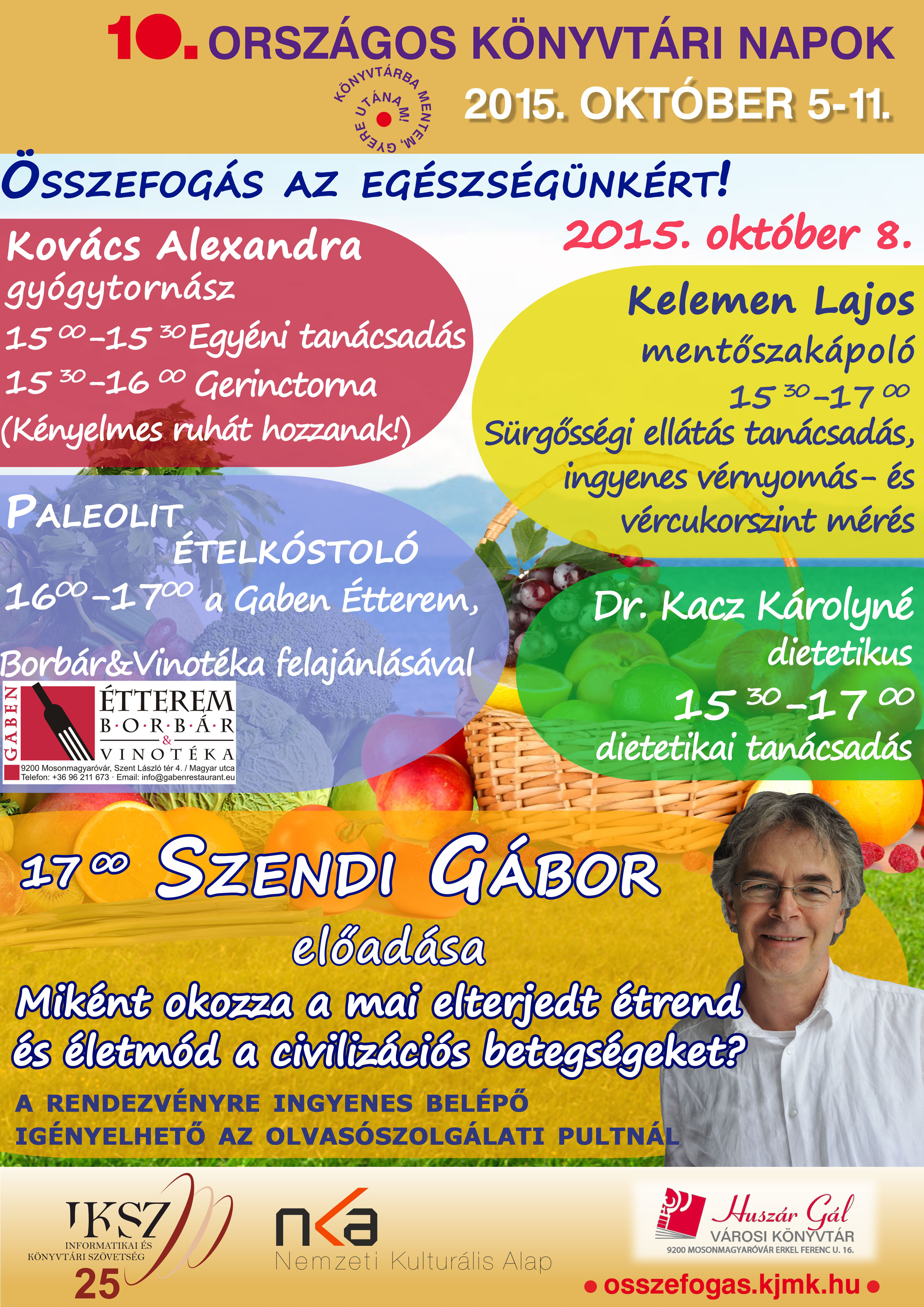 17:00: Szendi Gábor előadása: Miként okozza a mai elterjedt étrend és életmód a civilizációs betegségeket? – A rendezvényre ingyenes belépő igényelhető az olvasószolgálati pultnál