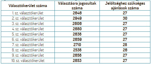 Az egyéni választókerületekben induló önkormányzati képviselők jelöléséhez az alábbi számban szükséges ajánlásokat benyújtani legkésőbb 2014. szeptember 8-án 16,00 óráig a Helyi Választási Irodánál (Mosonmagyaróvár, Fő u. 11.).