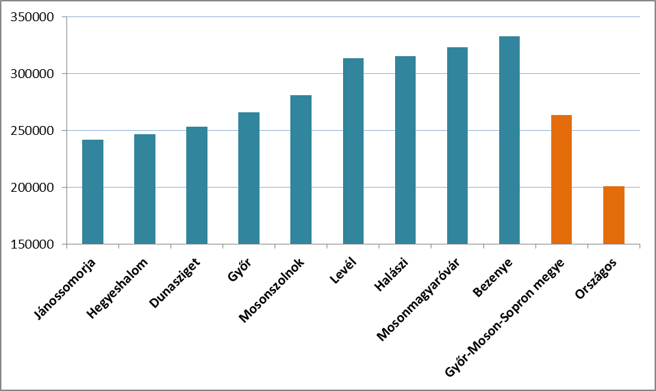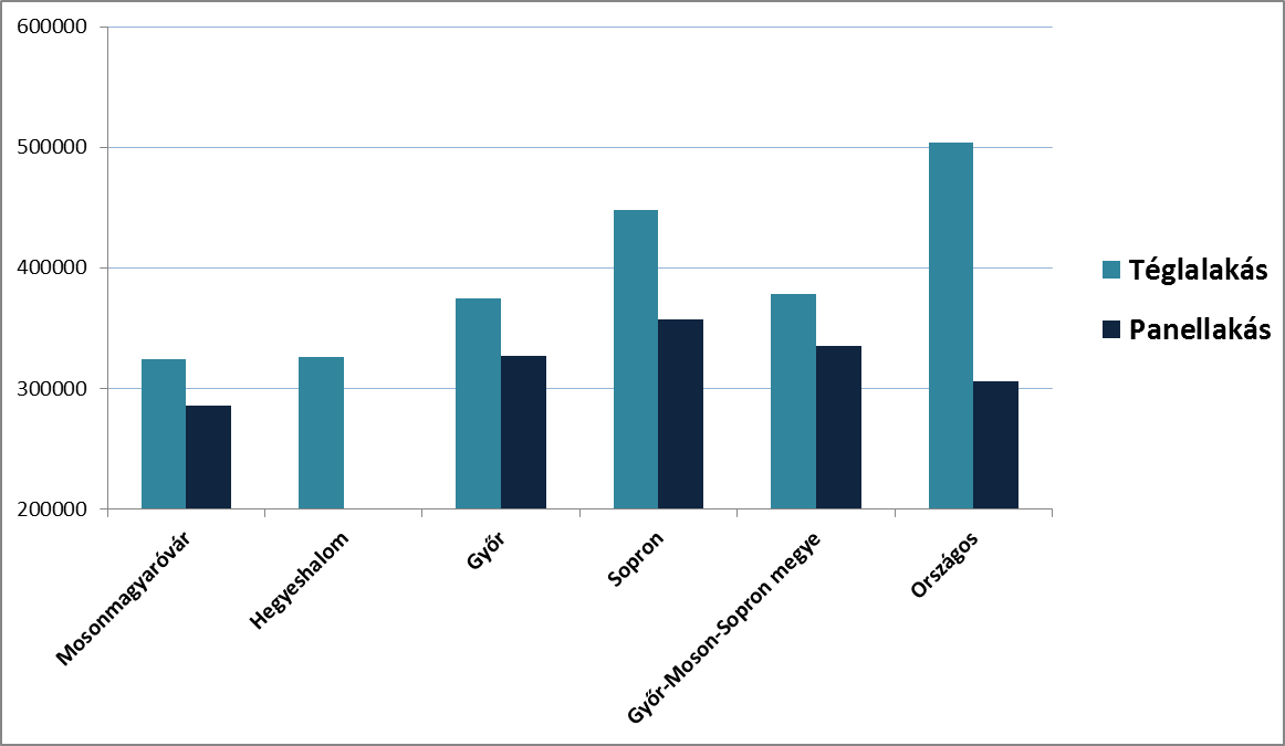 Településekre bontva meglehetősen eltérő kép mutatkozik. Jánossomorján és Hegyeshalmon az átlagos négyzetméterenkénti árak nem érik el a 250 ezer forintot, ezzel párhuzamosan Mosonszolnok, Mosonmagyaróvár és Bezenye 6-25%-kal meghaladja a megyeszékhely árszínvonalát.