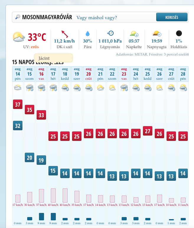 Szombaton elszórtan, de legfőképp a nyugati országrészben alakulhatnak ki záporok, zivatarok a napos idő mellett, majd vasárnap egyre többfelé. Zivatarok környezetében a szél is felerősödik. Hajnalban még kicsit felfrissülhetünk, ekkor 16-22 fok közé hűl majd a levegő. Napközben ugyanakkor továbbra is nagyon meleg lesz, a zivataroknak köszönhetően fülledtté is válik a levegő. Délutánonként 34-39°C közötti értékeket mérhetünk, a hőségriadó vasárnap éjfélig van érvényben.