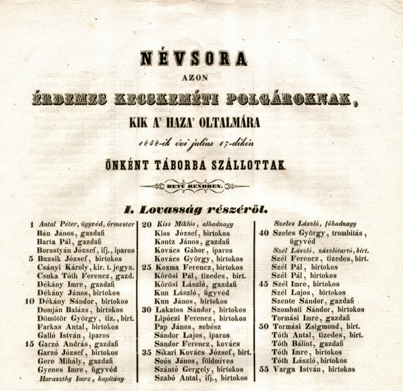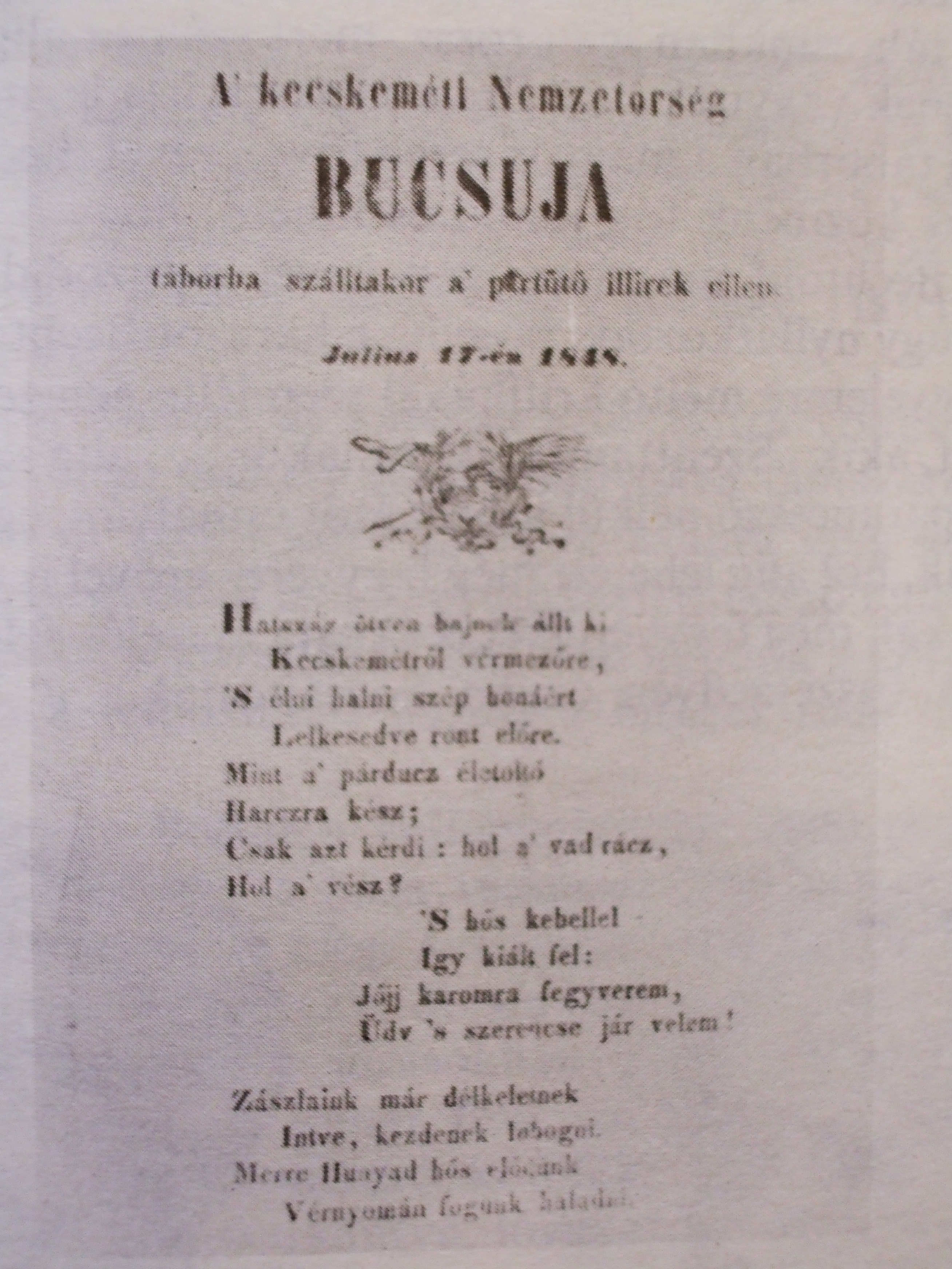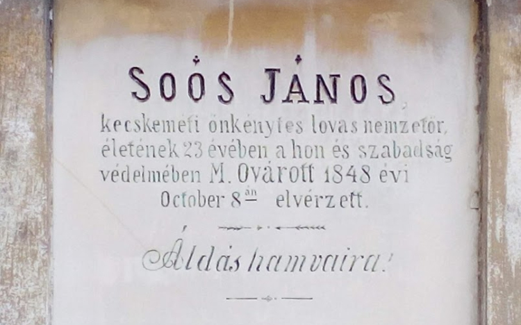 Soós János, kecskeméti önkéntes lovas nemzetőrnek állít örök emléket.