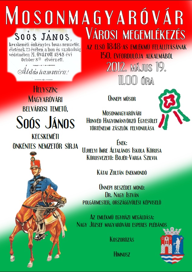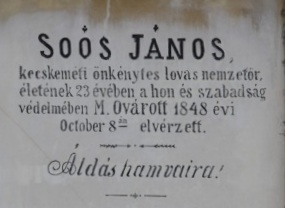 Soós János halála és temetése 170. évfordulóján kívánom, hogy Mosonmagyaróvár még sokáig emlékezzen méltó módon az 1848-as szabadságharc egyetlen hősi halottjáról, aki ugyan szülőföldjétől távoli földben nyugszik, ám a helyi lakosság mindig szeretettel és megbecsüléssel övezte emlékét és a sírját.