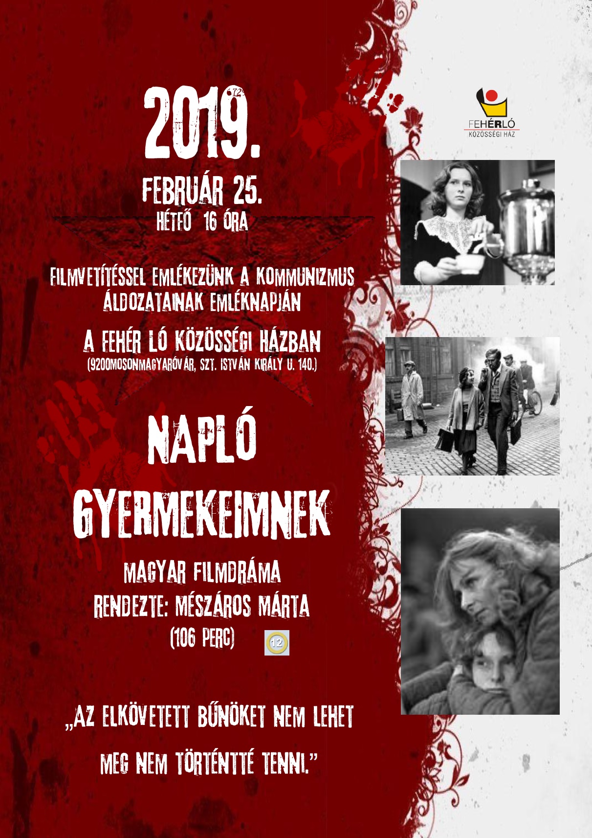 16-kor a Fehér Ló Közösségi Házban pedig Mészáros Márta: Napló gyermekeimnek c. filmet vetítik.