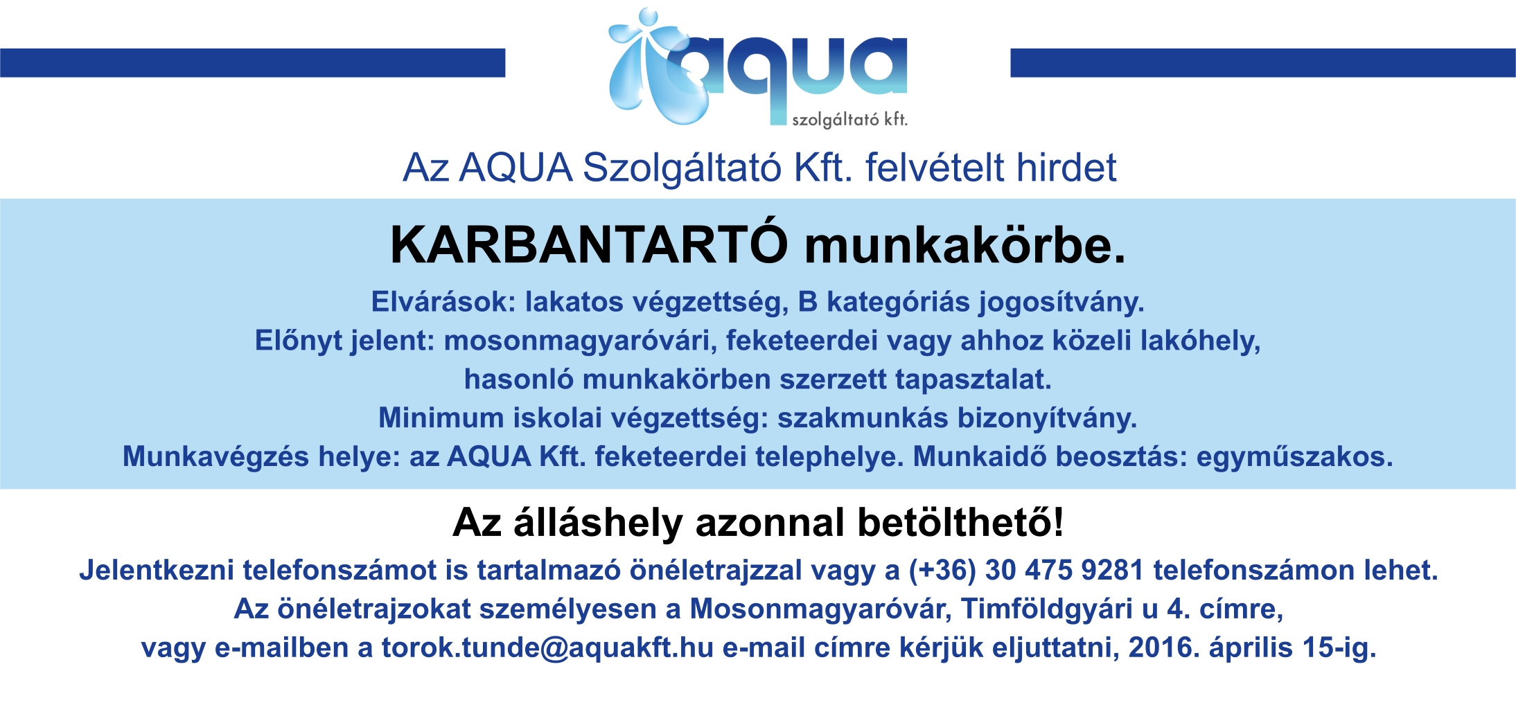 Álláshirdetés - karbantartót keres az Aqua Szolgáltató Kft.