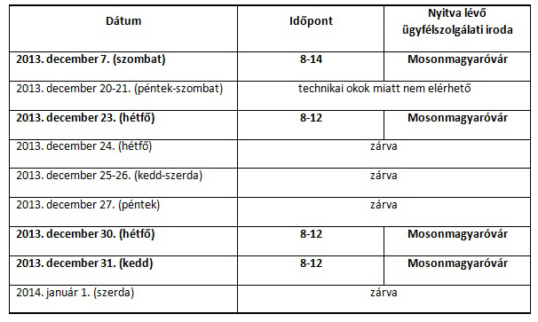 2013. december 7-én, 23-án és 30-31-én csak a mosonmagyaróvári ügyfélszolgálati iroda működik.