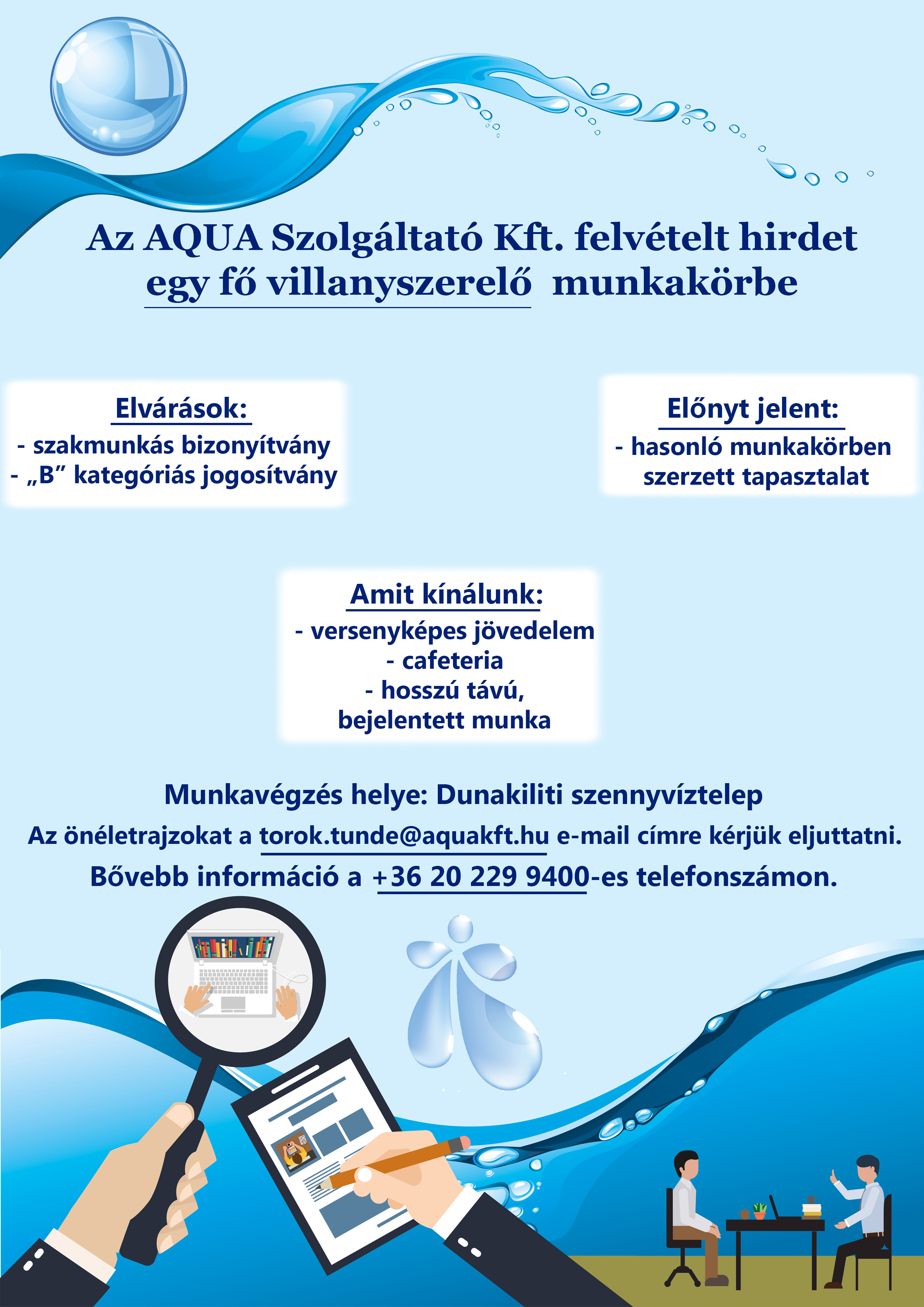 Az Aqua szolgáltató kft felvételt hirdet villanyszerelő munkakörbe