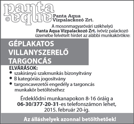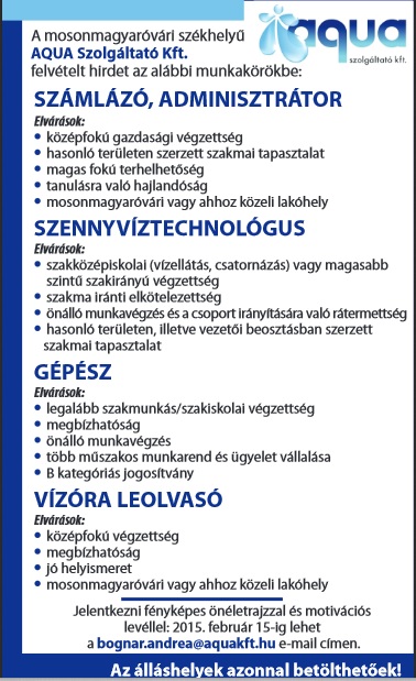 Az AQUA Szolgáltató Kft. felvételt hirdet az alábbi munkakörökbe:
