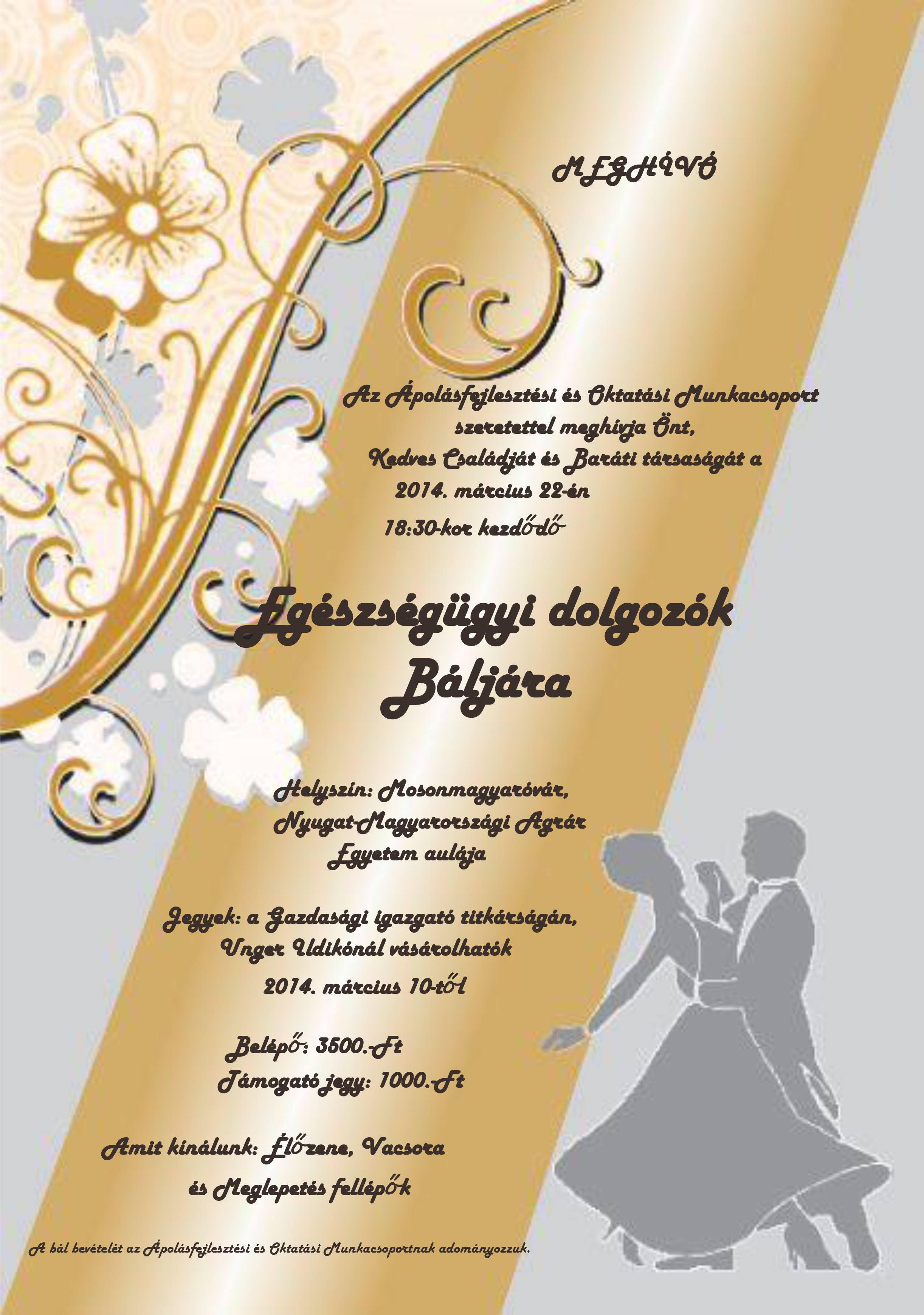 Az egészségügyi dolgozók báljára március 22-én, szombaon este fél 7-től kerül sor a Nyugat-Magyarországi Agrár Egyetem Aulájában. Jegyeket a gazdasági igazgató titkárságán, Unger Ilsikónál lehet venni március 10-től. A résztvevőket az este folyamán élő zenével, vacsorával és meglepetés fellépőkkel várják a szervezők. A belépőjegyek árából az Ápolásfejlesztési és oktatási Munkacsoportot támogatják majd.