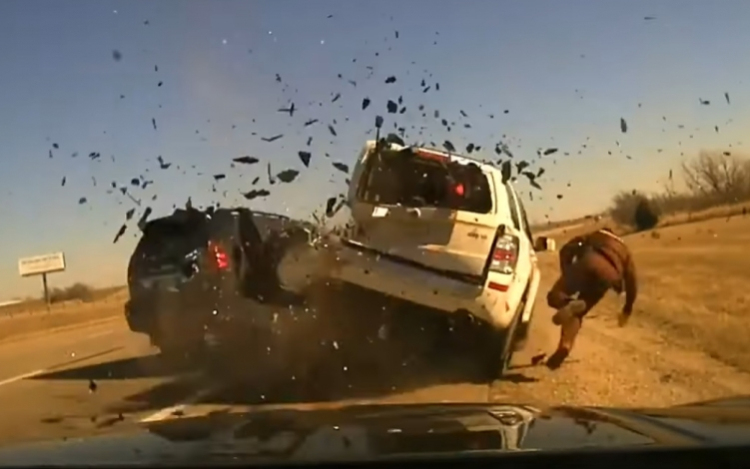 Csodával határos módon a három érintett csak könnyebben sérült abban a közúti balesetben, amely az amerikai 40-es autópálya oklahomai részén történt a Cimarron Road kihajtója előtti leállósávban. A felvételen jól látni, hogy a szolgálati jármű előtt a terepjáró teljes terjedelemben a leállósávban parkolt, nem lógott át záróvonalon, és az autópálya-rendőrség egyenruhása a jobb oldalához ment, és a lehúzott ablakon keresztül beszélt a vezetővel. Pár pillanattal később a fehér terepjáróba oldalról belehajtott egy fekete SUV, amitől a rendőr oldalvást hátralökődött, és arccal lefelé a fűcsomós talajra zuhant. Azt is látni, hogy az egyenruhás átfordul, majd rögtön felugrik, és távolabbra szalad.
