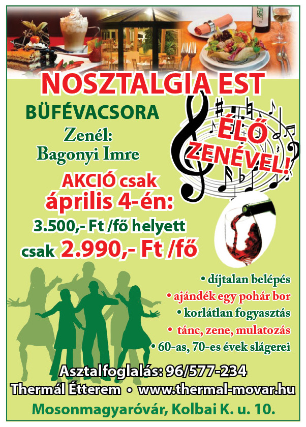 Úgy érzi, semmi lehetőség az igazi szórakozásra a városban?! Nincsen a korosztályának megfelelő zenés rendezvény? Akkor jöjjön el a Thermál Étterem NOSZTALGIA EST-jére, és meglátja, törzshelye lesz éttermünk!