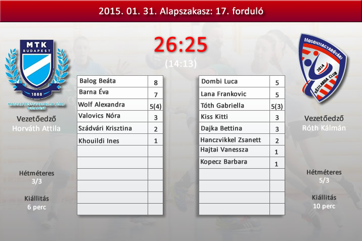 Alapszakasz 17. forduló I Népfürdő u. sportcsarnok I MTK Budapest – MKC SE 26:25 (14:13)