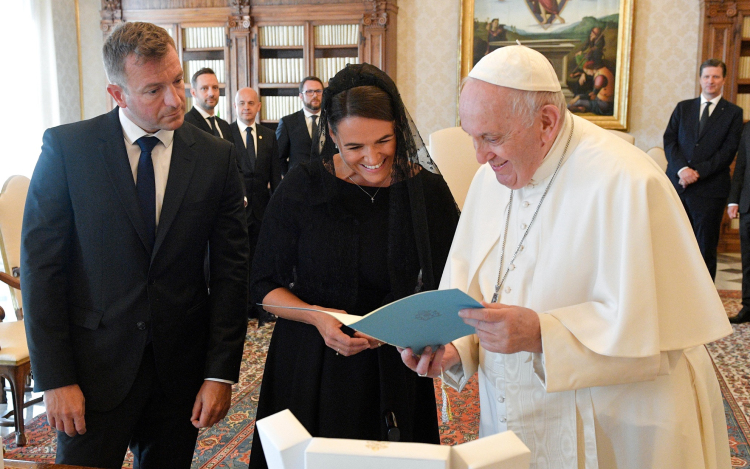 Novák Katalin közölte, hogy 40 perces magánaudiencián járt a katolikus egyházfőnél. A találkozónak három fő témája volt: a jövő évben esedékes magyarországi pápalátogatás, az ukrajnai háború és a családok támogatása.