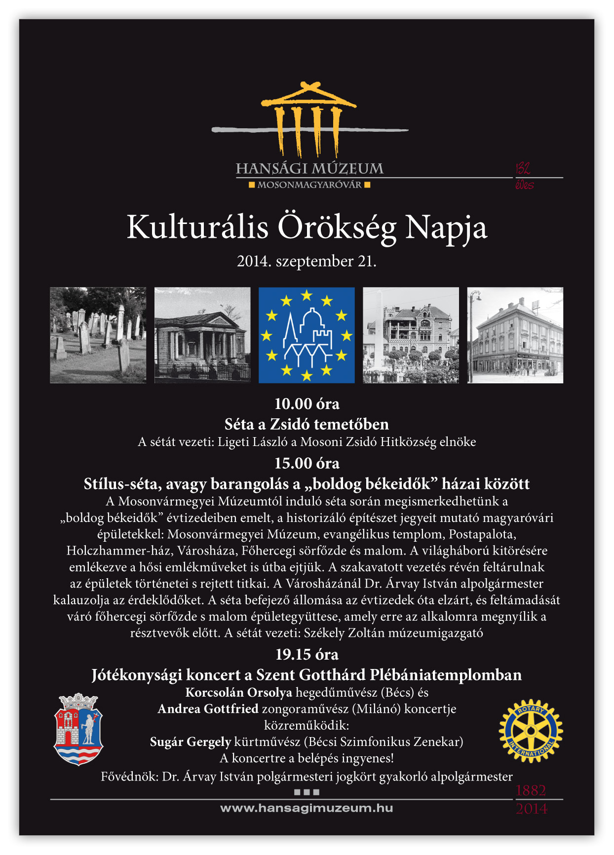Tisztelettel ajánlom figyelmükbe a Kulturális Örökség Napjai mosonmagyaróvári városi programjait, melybe a Hansági Múzeum és a Mosoni Zsidó Hitközség is becsatlakozott. Nagyszerű lehetőség a város épített örökségeit megtekinteni csak az élmény, a többet tudás vágyáért is. Szeptember 21-én délelőtt 10 órakor Ligeti László elnök a Zsidó temetőben kalauzol, 15 órakor pedig Székely Zoltán múzeumigazgató vezetésével séta indul a Mosonvármegyei Múzeumtól. Megtekinthető lesz a Múzeum, az evangélikus templom, a Postapalota, a Holczhammer-ház. Különleges alkalom, hogy az egykori Főhercegi sörfőzde és malom épületének bizonyos részei is látogathatók lesznek kis időre. 17 órakor a Városházára várom Önöket, ahol bemutatom a 120 éves Dísztermet is. A részletes programról a www.hansagimuzeum.hu oldalon tájékozódhatnak.