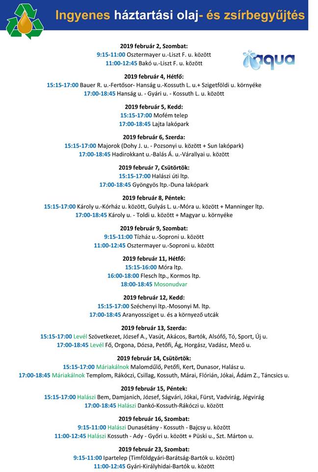 Ezúton tájékoztatjuk Önöket a 2019. február havi olajbegyűjtési helyszínekről és időpontokról,