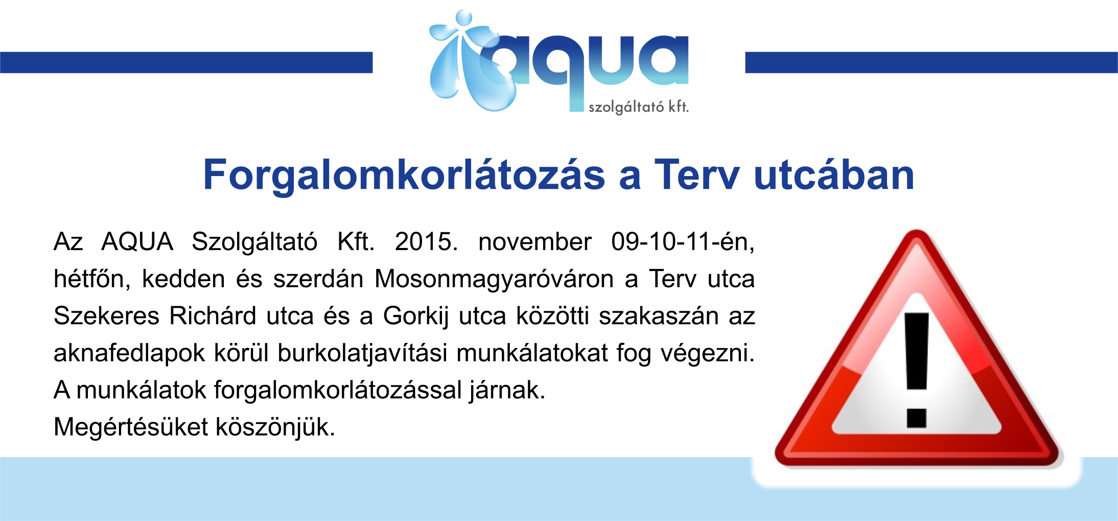 Az Aqua Szolgáltató Kft. 2015. november 09-10-11-én, hétfőn, kedden és szerdán Mosonmagyaróváron aknafedlapok körül burkolatjavítási munkálatokat fog végezni. A munkálatok forgalomkorlátozással járnak.
