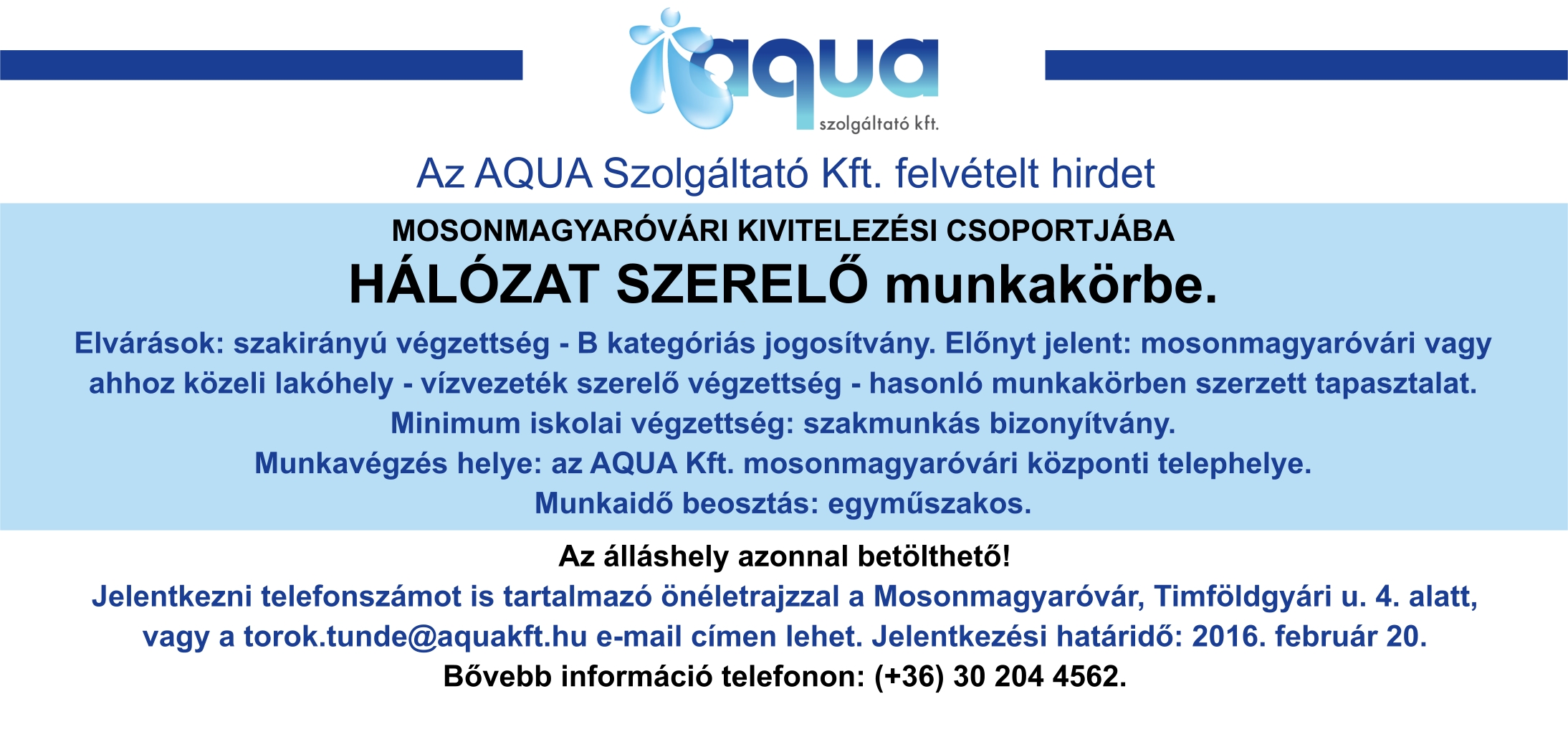 Jelentkezni telefonszámot is tartalmazó önéletrajzzal lehet. Az Önéletrajzokat személyesen a Mosonmagyaróvár Timföldgyári u 4. címre, vagy e-mailen a torok.tunde@aquakft.hu e-mail címre 2016. február 20-ig kérjük eljuttatni.