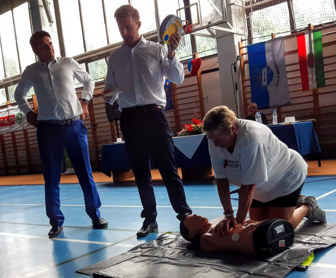 Az újraélesztési bemutatón az automata defibrillátor (AED) használatával is megismerkedhettünk. Minden csapat egy tagja, az elméleti ismertetőt követően a gyakorlatban is bemutathatta tudását a legmodernebb szimulációs eszközök segítségével.