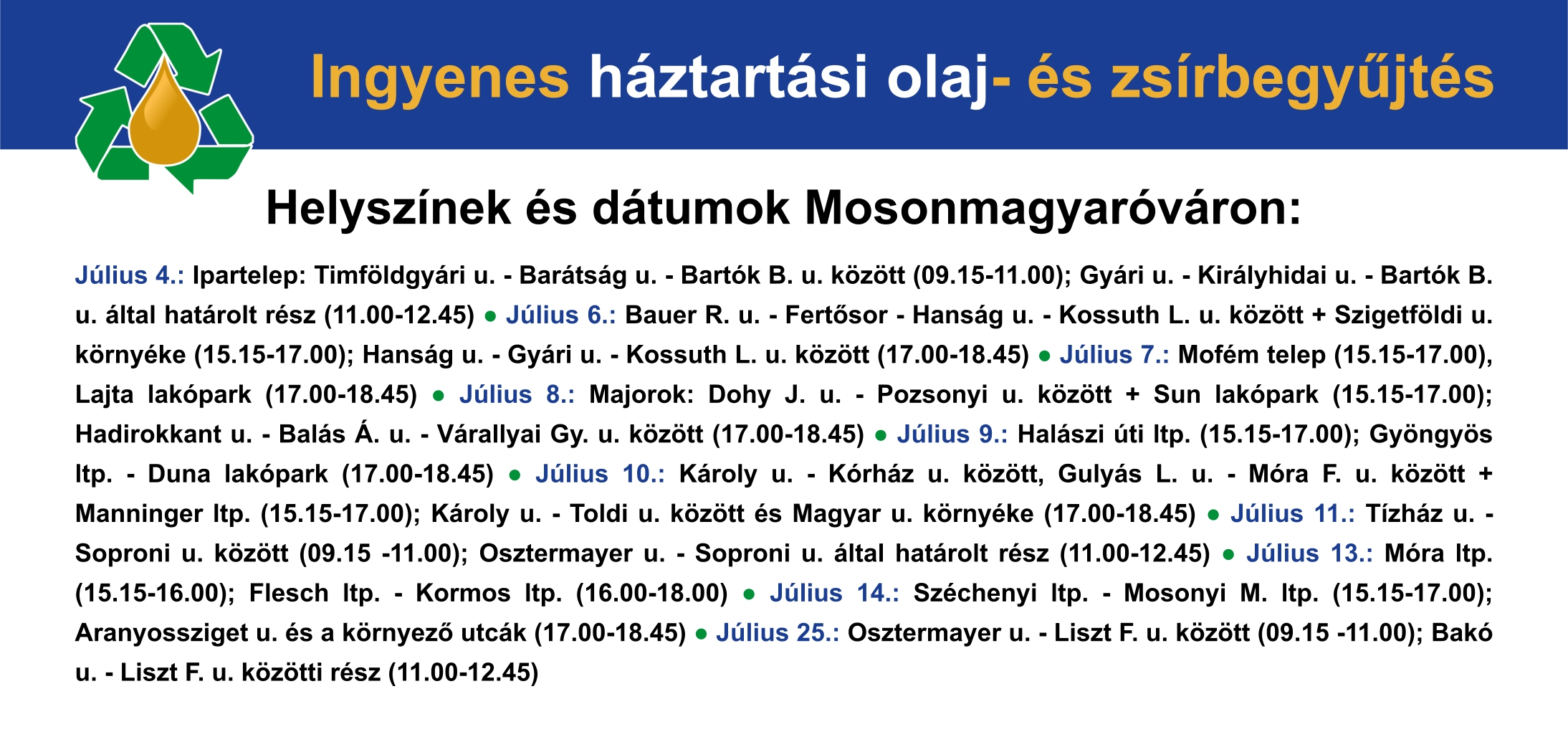 Gyűjtse Ön is szelektíven a háztartásában elhasználódott olajat és zsírt, majd adja le a gyűjtőautóknál, védve ezzel környezetét és saját lefolyórendszerét! A veszélyes hulladéknak minősülő használt olajat az AQUA Szolgáltató Kft.energiaként újrahasznosítja!