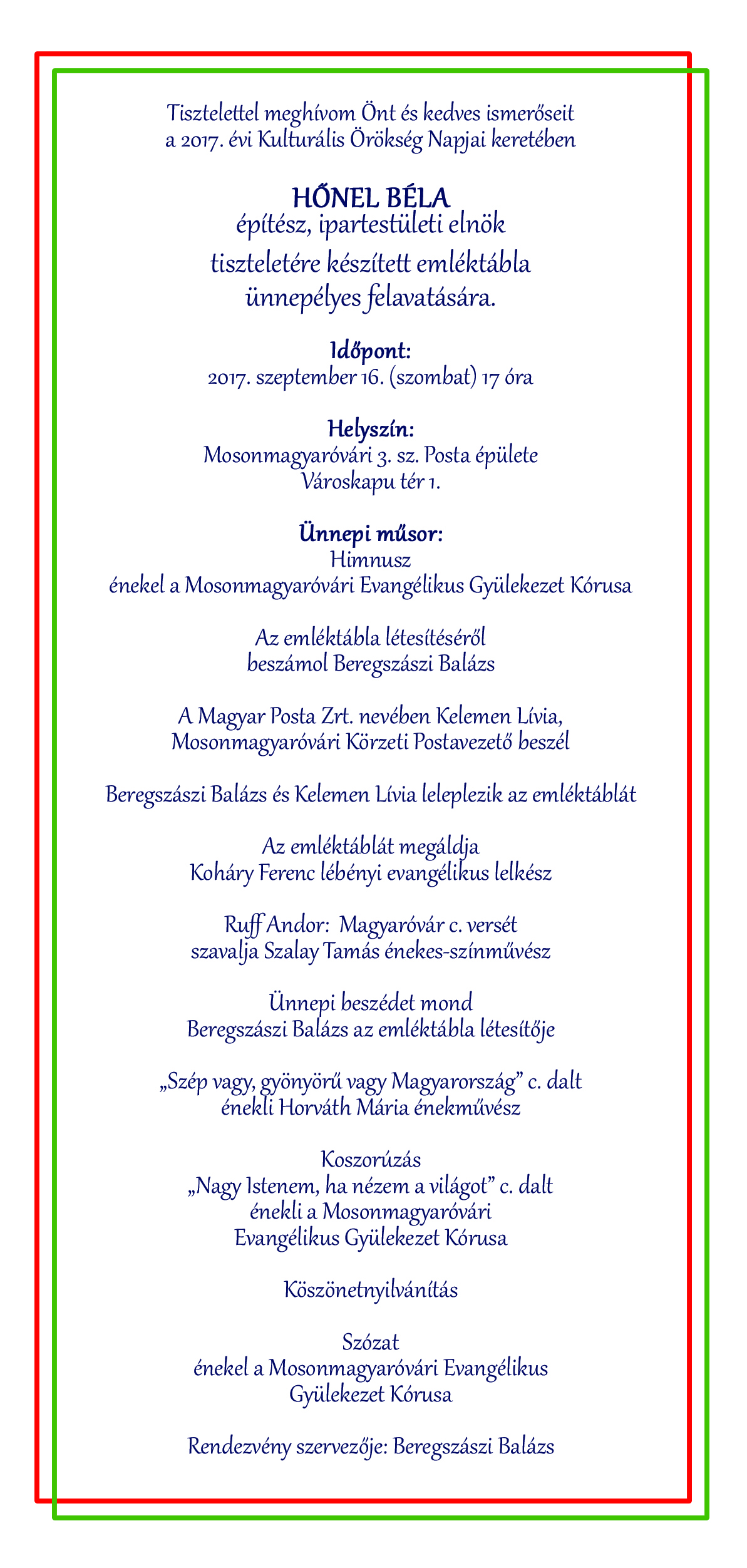 Szeptember 16-án, szombaton 17 órakor - a 2017. évi Kulturális Örökség Napok keretében - lesz a Hőnel Béla emléktábla avatás Mosonmagyaróváron, a Városkapu tér 1. sz. alatti Postapalota épületénél.