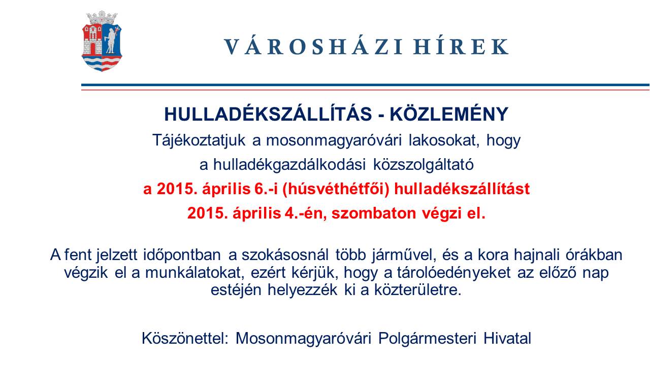 A hulladékgazdálkodási közszolgáltató a 2015. április 6.-i (húsvéthétfői) hulladékszállítást 2015. április 4.-én, szombaton végzi el.
