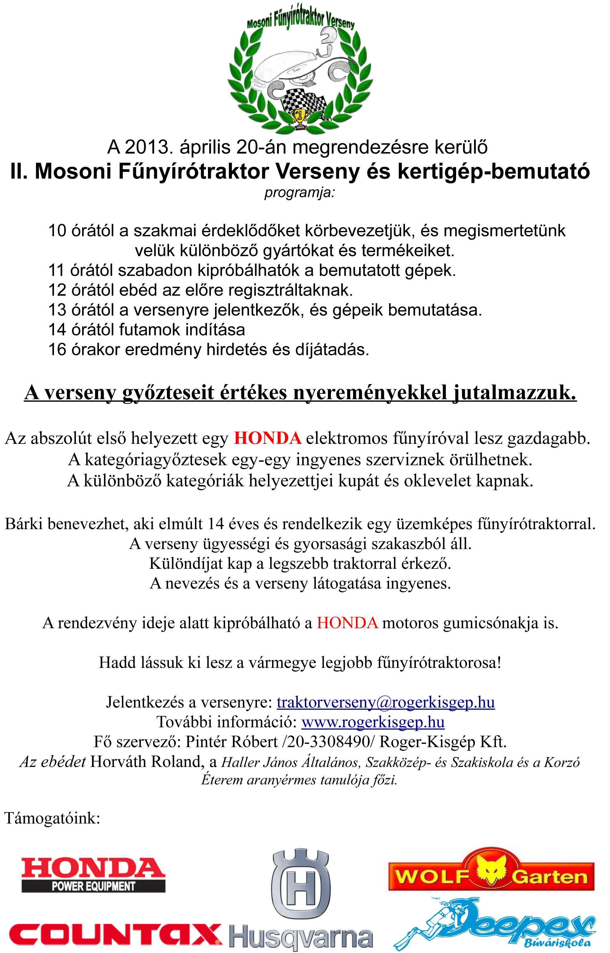 2013. április 20-án megrendezésre kerül a II. Mosoni Fűnyírótraktor Verseny és kertigép-bemutató a Gabona rakparton.