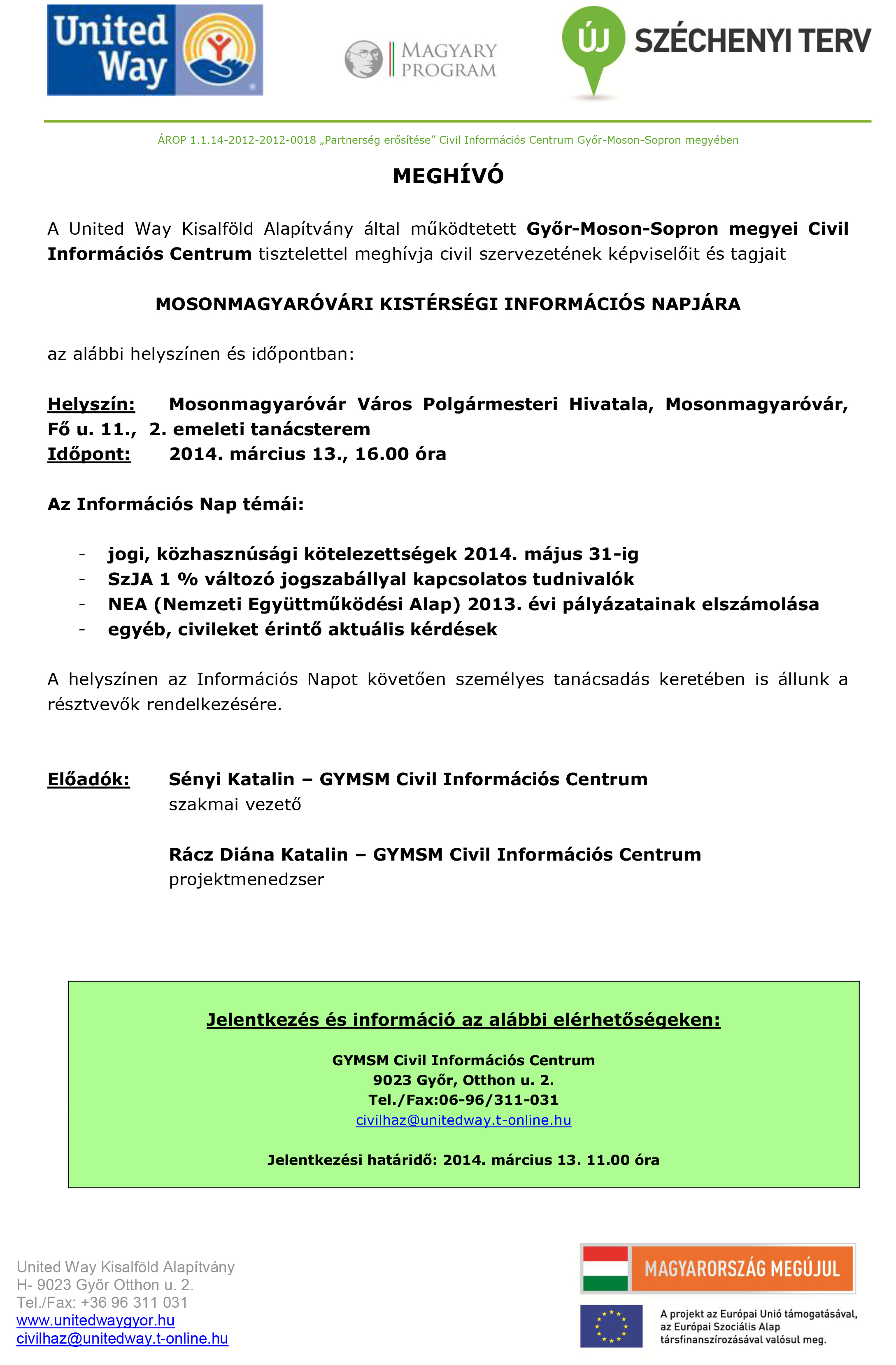 A United Way Kisalföld Alapítvány által működtetett Győr-Moson-Sopron megyei Civil Információs Centrum a civil szervezetének képviselőinek és tagjainak tart információs napot március 13-án, 16 órától.