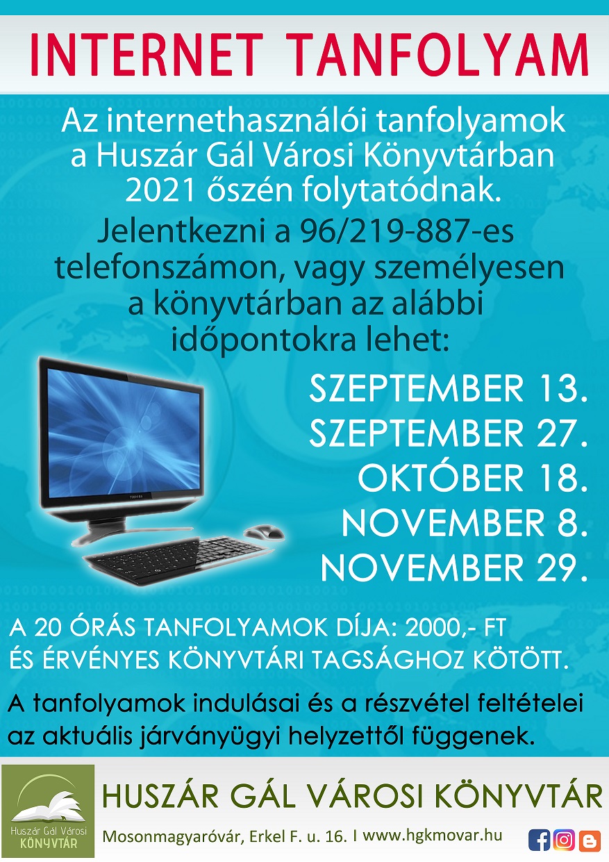 Ismét elindítja nagy sikerű internet tanfolyamát a Huszár Gál Városi Könyvtár. Az első alkalom szeptember 13-án lesz.