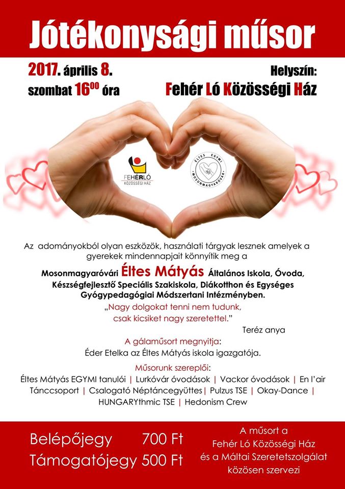 Április 8-án, szombaton 16 órakor jótékonysági műsort rendez a Fehér Ló Közösségi Ház az „Éltes Mátyás Alapítvány a Fogyatékos Gyermekekért ” alapítvány javára.