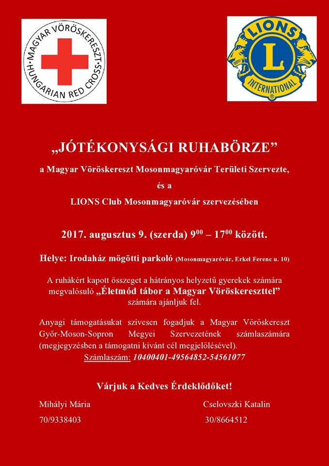 Jótékonysági ruhabörze a Magyar Vöröskereszt Mosonmagyaróvár Területi Szervezete és a Lions Club Mosonmagyaróvár szervezésében.