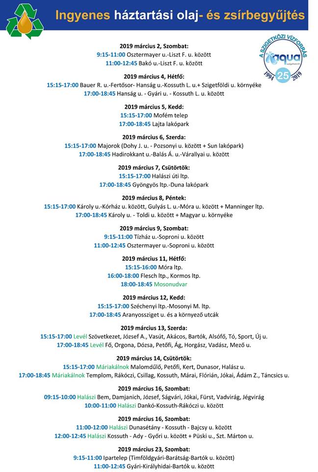 Ezúton tájékoztatjuk Önöket a 2019. március havi olajbegyűjtési helyszínekről és időpontokról, melyet megtekinthetnek a www.aquakft.hu weboldalon, illetve mobil applikációnkon is.
