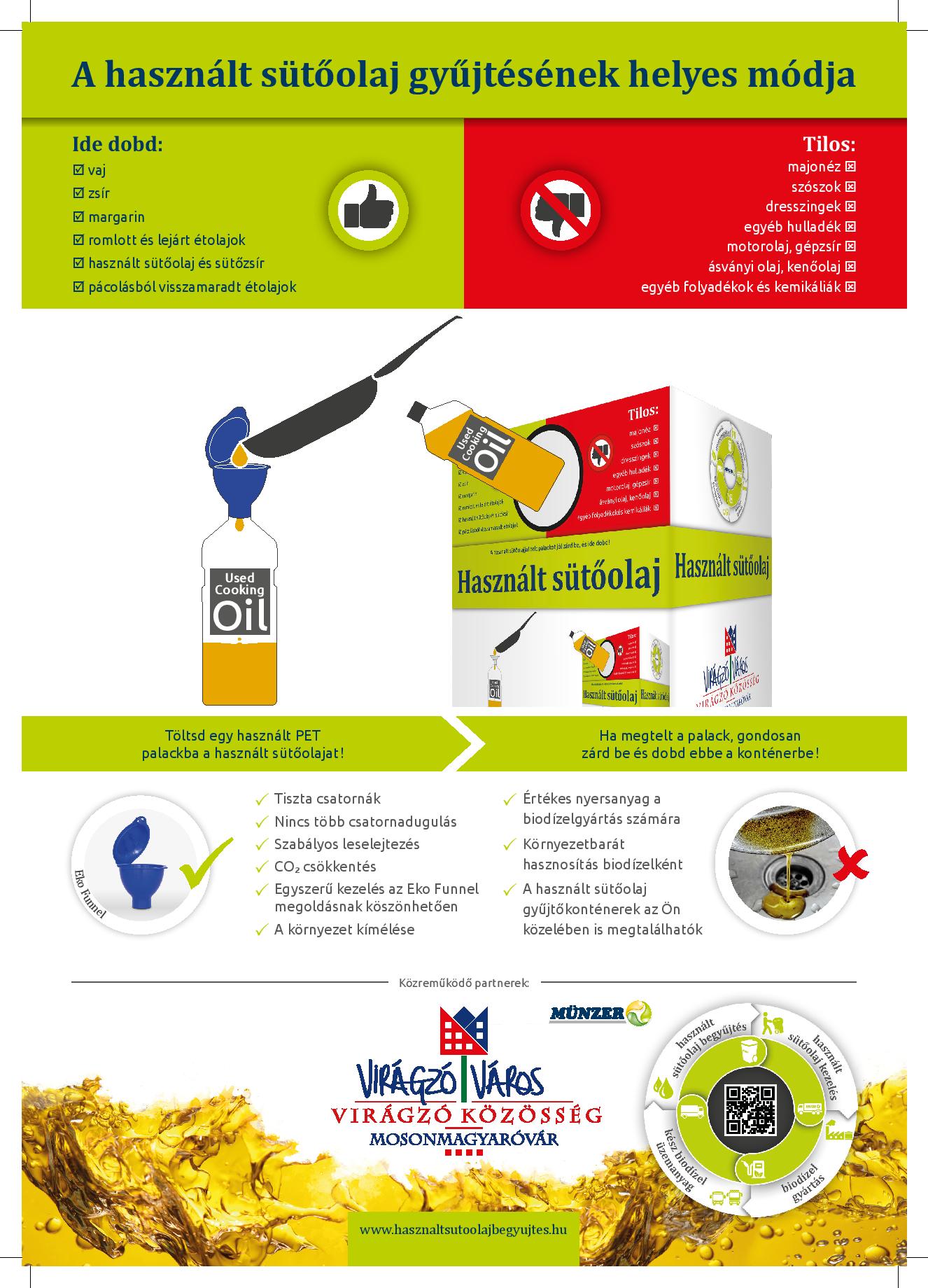 A többszöri sütés folyamán a sütőolajban, zsírban olyan elváltozások jönnek létre, melyek gasztronómiai értékvesztéssel járnak. Továbbá olyan bomlástermékek képződnek, amelyek egy része káros lehet az egészségre, hisz a túlhevülés miatt a használt étolaj rákkeltő anyagokat fog tartalmazni.A közvetlen egészségkárosító hatásán túl a környezetre is károsító hatással bír, ha nem gondoskodunk megfelelő gyűjtéséről, kezeléséről. Így igen gyakran a lefolyókba kerül a további sütésre-főzésre alkalmatlan étolaj. Ezt megelőzendő korábban az AQUA Kft. indított házhoz menő begyűjtési rendszert, mely kiegészül 2020 márciusától 10 helyen Mosonmagyaróváron, továbbá 8 térségi településen (Darnózseli, Dunakiliti, Feketeerdő, Halászi, Hegyeshalom, Bezenye, Máriakálnok, Mosonudvar), szelektív gyűjtőszigeten külön gyűjtőedényben történő elhelyezés lehetőségével is. A Kft. a használt sütőolaj és zsiradék gyűjtésére erre a célra rendszeresített speciális zárt fém konténert helyez ki a Társulással egyeztetett helyeken. A lakosság ezekbe a konténerekbe zárt pet palackban tudja bedobni a keletkezett használt sütőolajat.Speciális tölcsér is kiosztásra kerül ill. megvásárolható lesz, mely kompatibilisen rácsavarható a 1,5 literes műanyag flakonokra, így az olaj könnyen betölthető. A tölcsérnek zárható teteje van. Ha megtelik a palack, a tölcsér helyére visszakerül a kupak, a tölcsér pedig egy új üres flakonra rakható fel.