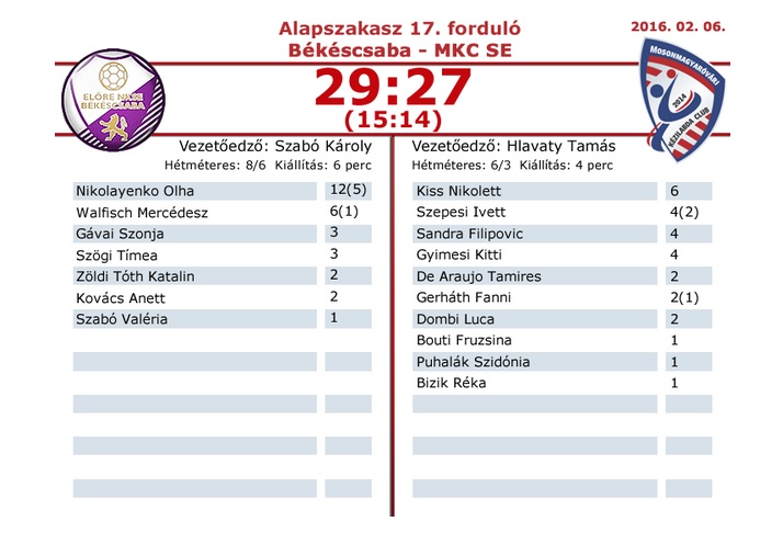 A lendületes kezdést követően kiélezett félidőt láthatott az a közel 800 néző, aki kilátogatott a békéscsabai városi sportcsarnokba. Az első negyed során még a játékosaink diktálták a tempót, de a szerepkörök a játékrész végére felcserélődni látszottak. A támadásainkra még ekkor sem igazán lehetett panasz, de a kapusteljesítmény és a védelem bőven hagyott maga után kívánni valót.