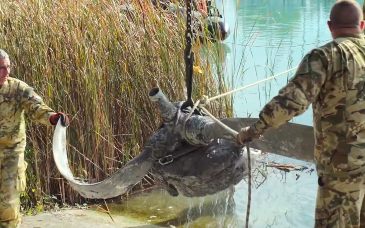 A négy és fél méteres mélységben lévő roncsot további 80 centiméter iszap takarja, de meglepően jó állapotban van a kiemelt légcsavar.