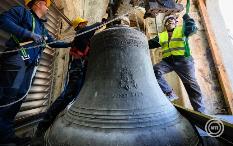 Végül egy acélszerkezetre csörlővel emelték rá a harangot, majd egy speciális görgősoron juttatták el az egyik toronyablakhoz, ahonnan daruval emelték le – ismertette a folyamatot Most Balázs. Hozzátette: a harang restaurálása során egy új, az eredetihez hű bronzkoronát is készítenek.