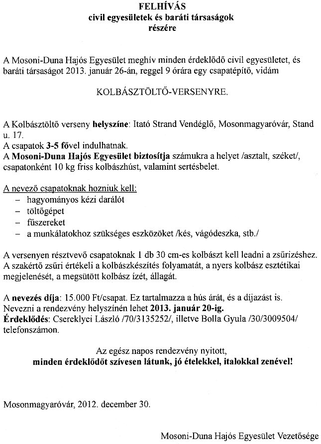 A Mosoni-Duna Hajós Egyesület felhívása, mely szerint városunkban működő civil egyesületek és baráti társaságok részére Kolbásztöltő versenyt hirdetnek.