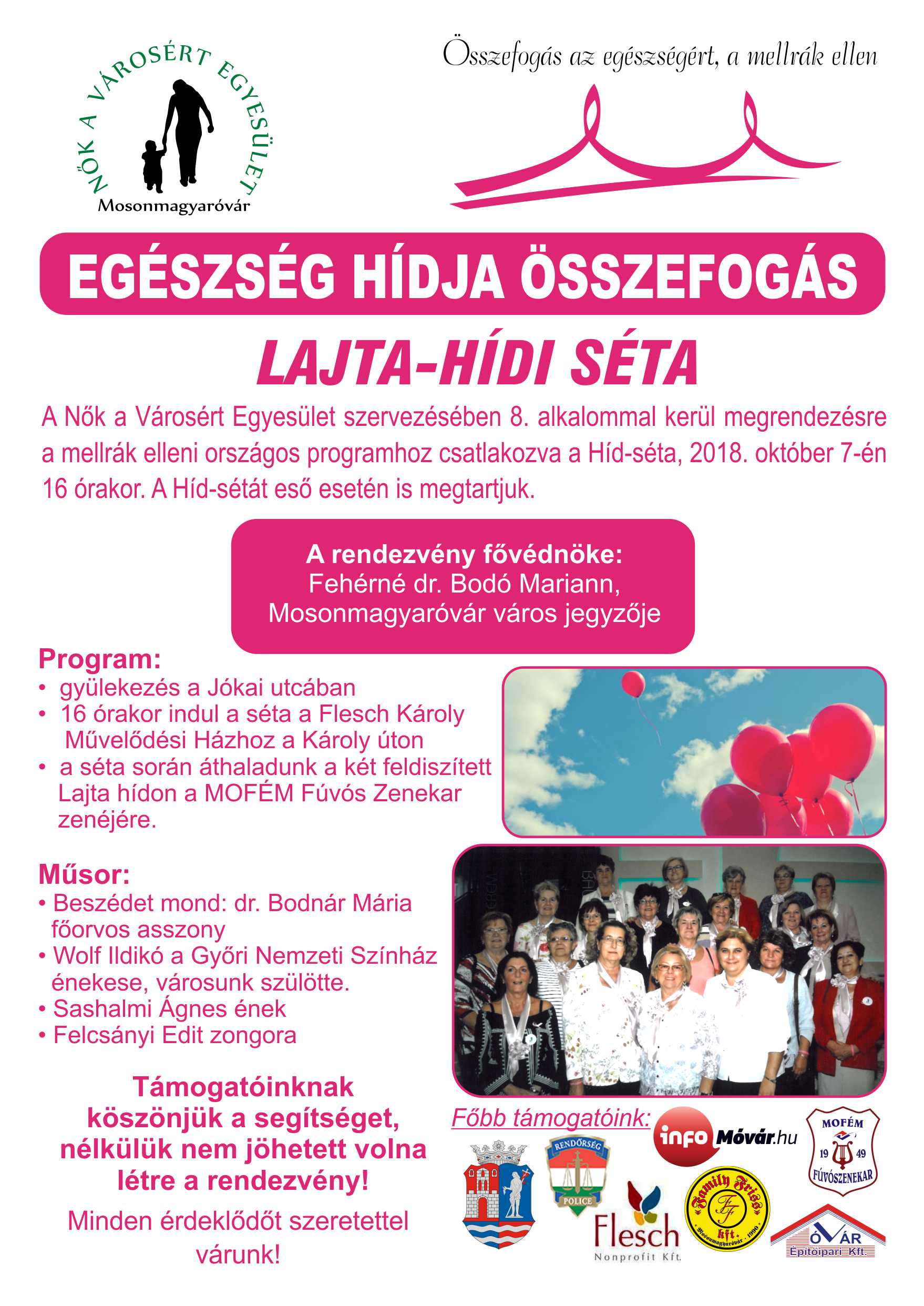 A Nők a Városért Egyesület immár 8. alkalommal rendezi meg a Híd-sétát, mellyel a mellrák elleni országos programhoz csatlakoznak. Időpont: 2018. október 7. 16.00