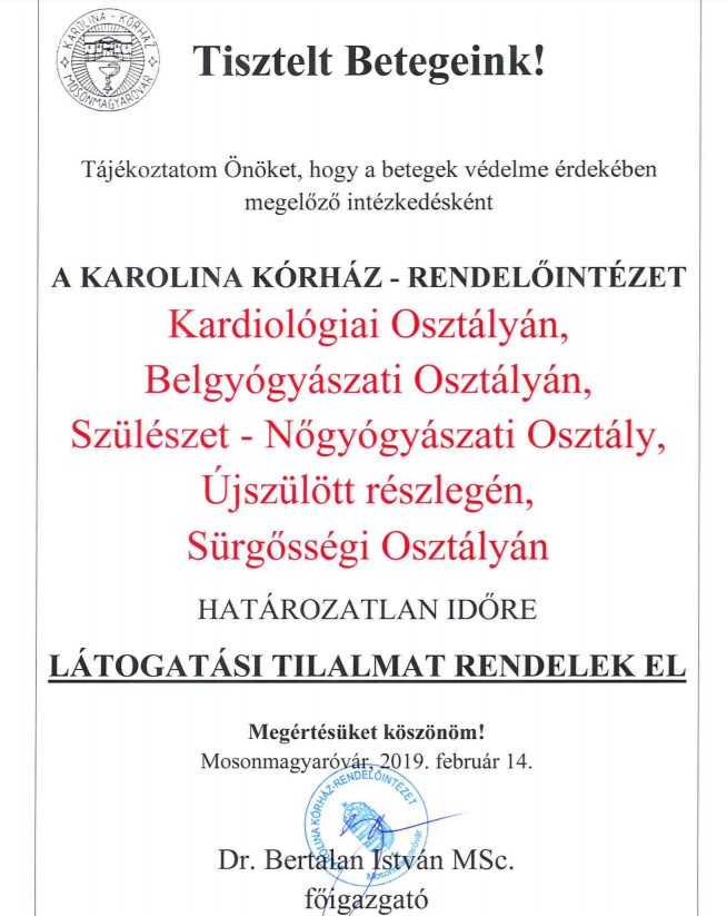 "Tájékoztatom Önöket, hogy 2019.02.05-től a betegeink védelme érdekében megelőző intézkedésként a Karolina Kórház és Rendelőintézet Kardiológiai osztályán határozatlan időre LÁTOGATÁSI TILALMAT, továbbá az Szülészet Nőgyógyászati osztály Újszülött részlegén RÉSZLEGES LÁTOGATÁSI TILALMAT RENDELEK EL. A kisbabákat az édesapák látogathatják. "