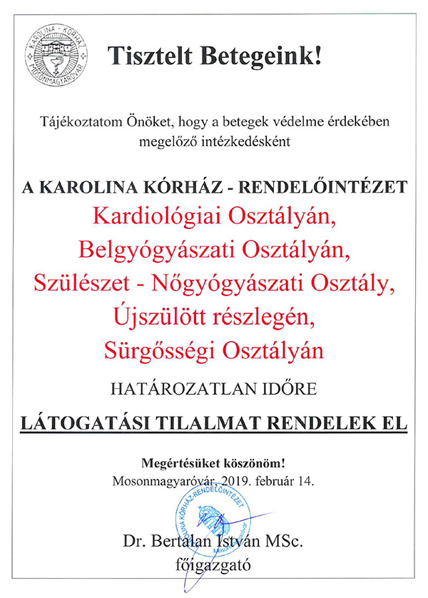 2019. február 14-től a Karolina Kórház és Rendelőintézet egyes osztályain látogatási tilalmat rendeltek el. A tilalom visszavonásig érvényes.