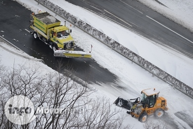 Hómarókkal és hóekékkel dolgoznak a Győr-Budapest felé vezető M1 autópálya 119 és a 103 km szelvények közötti szakaszának felszabadításán. Szakaszosan, apró lépésenként jutnak egyre előrébb a munkagépekkel a pályatest tisztításában.
