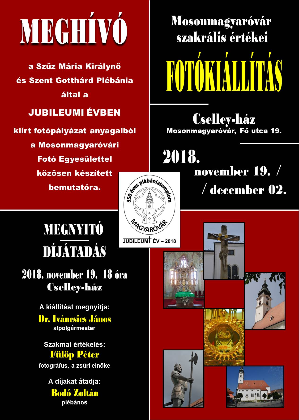 A Plébánia által „Mosonmagyaróvár szakrális ereklyéi” címmel meghirdetett országos amatőr fotópályázat értékelésére a Cselley-házban kerül sor. A pályamunkákból kiállítást szerveztünk, amelyet dr. Iváncsics János alpolgármester nyit meg. A nemes vetélkedésről Fülöp Péter fotográfus, a Győri Arany János Művelődési Ház igazgatója, a zsűri elnöke számol be, míg a díjakat Bodó Zoltán plébános adja át. A tárlat december 2-ig látogatható.