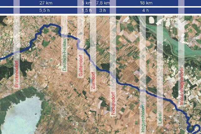 A városban lévő szakasz 8,5 km. ez kb. jó óra, 1,5 óra evezés. Zurndorftól Móvárig pedig két napos, kb. 62 km.