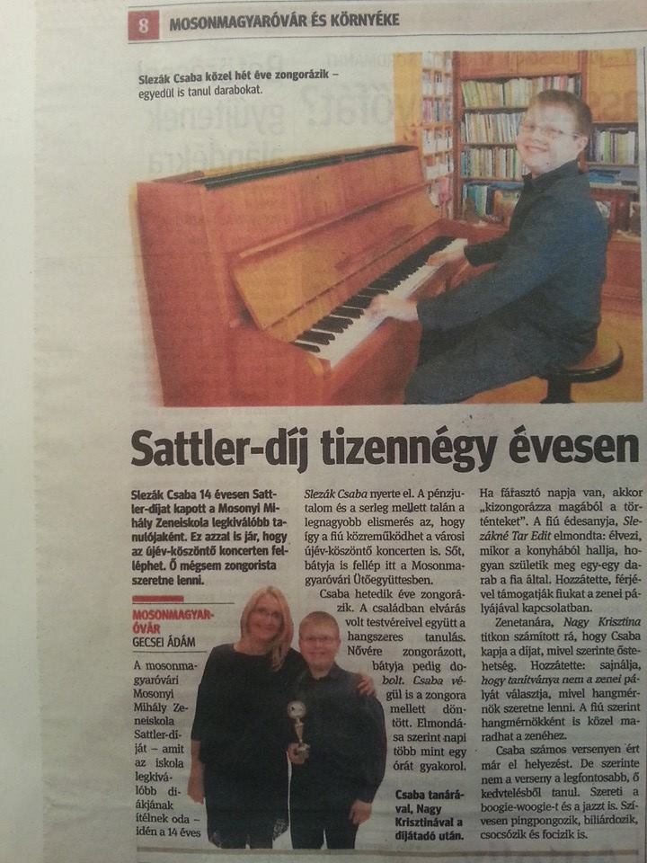 2013-ban kaptam „SATTLER”-díjat a Mosonyi Mihály Zeneiskolában, előtte két évvel megkaptam a Tanszak legjobb növendéke-díjat és kétszer voltam Nívó díjas - egyszer a Csornain, egyszer pedig a Mosonmagyaróváron megrendezett versenyen. A győri versenyen ezüst fokozatot értem el, a szombathelyi Sistrumon (Regionális Zenei Verseny) pedig kétszer arany és egyszer ezüst fokozatot kaptam. A felkészítésben és a mindennapos munkában nagy köszönet illeti Nagy Krisztina zongora tanárnőt, akinek azért is hálás vagyok, amiért nagy segítséget ad a saját utam megtalálásában. Valamint köszönet illeti Németh Gusztávné Julika nénit, Mollnernè Balogh Veronika tanárnőt is.