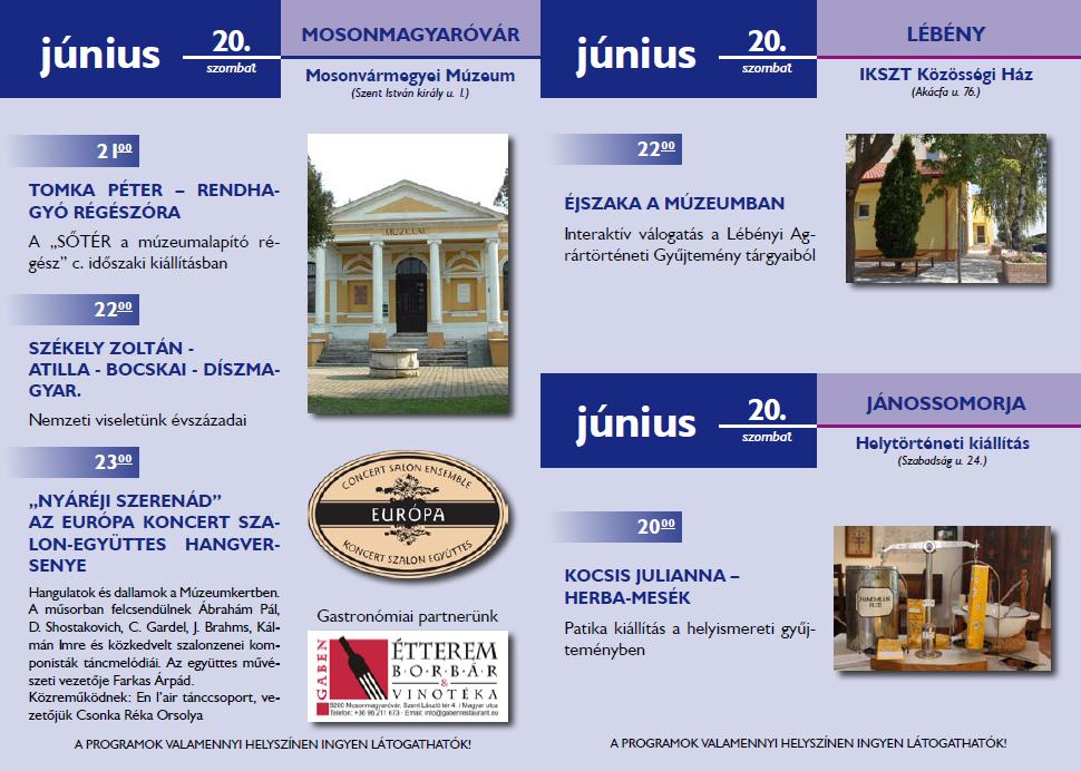 A több mint egy évtizedes múltra visszatekintő Múzeumok Éjszakája az idei esztendőben megújulva várja a látogatókat: országszerte immáron egy héten keresztül zajlanak a legkülönbözőbb programok. Nem lesz ez másként a Szigetközben sem. A mosonmagyaróvári Hansági Múzeum, karöltve a környékbeli települések – Jánossomorja, Kimle, Levél, Lébény, Máriakálnok – kiállítóhelyeivel, falumúzeumaival hét estére kínál időtöltést.