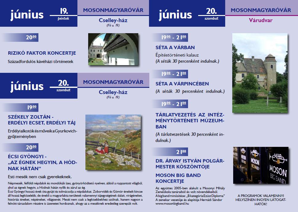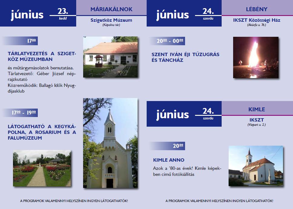 Június 19. és 29. között koncertek, rendhagyó tárlatvezetések, kiállítás-megnyitók, tűzugrás és táncház, varázslatos mesék (nem csak gyerekeknek) és dunai hajókirándulás szerepel a palettán. Közös célunk, hogy minél többet mutassunk meg a Szigetköz gazdag kulturális, természeti és gasztronómiai értékeiből, és hogy minél különlegesebb s változatosabb élményeket kínáljunk fel az itt lakóknak és az idelátogatóknak.
