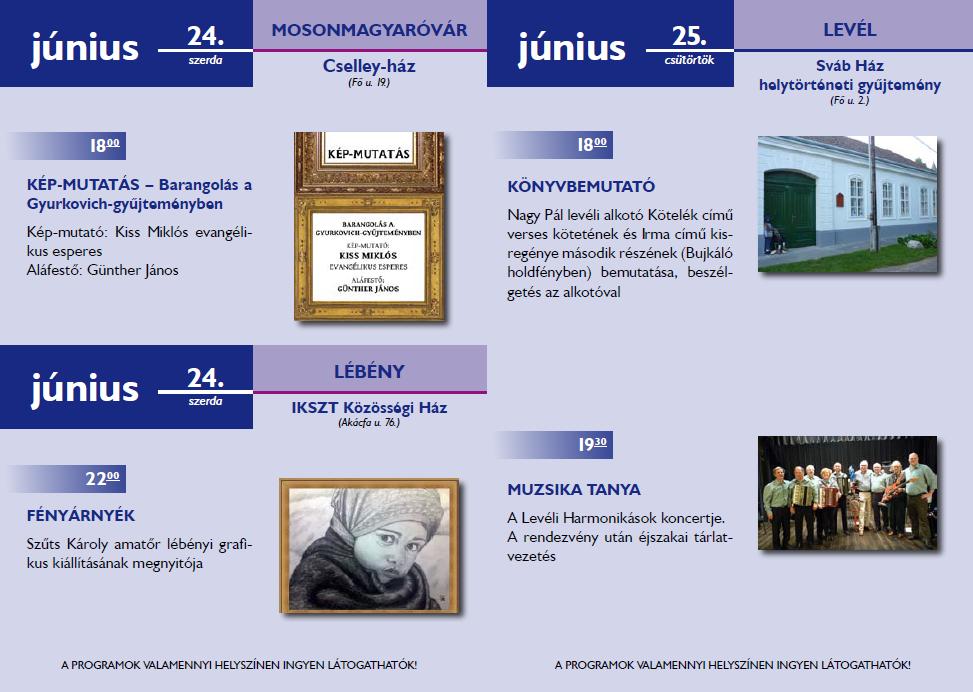 Gazdag kínálattal várja az érdeklődőket Lébény városa is, ahol a letűnt paraszti világ egykori eszközeit próbálhatják ki a látogatók, egy kortárs kiállítás megnyitóján vehetnek részt s hajnalig rophatják a táncházban. Jánossomorja „herba-mesékkel”, míg Kimle helytörténeti fotókiállítással várja látogatóit. A szigetközi falvak közül Halászi, Levél s Máriakálnok is várja a látogatókat