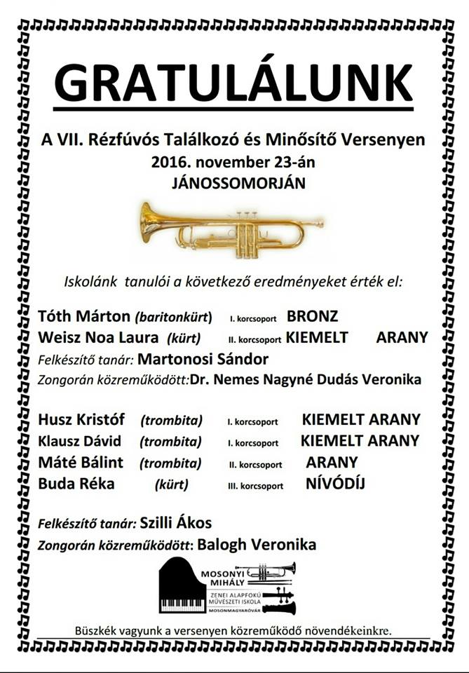 A VII. Rézfúvós Találkozó és Minősítő Versenyen szerepeltek a Mosonyi Mihály Zeneiskola növendékei. A megmérettetésnek a jánossomorjai Balassi Bálint Művelődési Központ adott helyet.