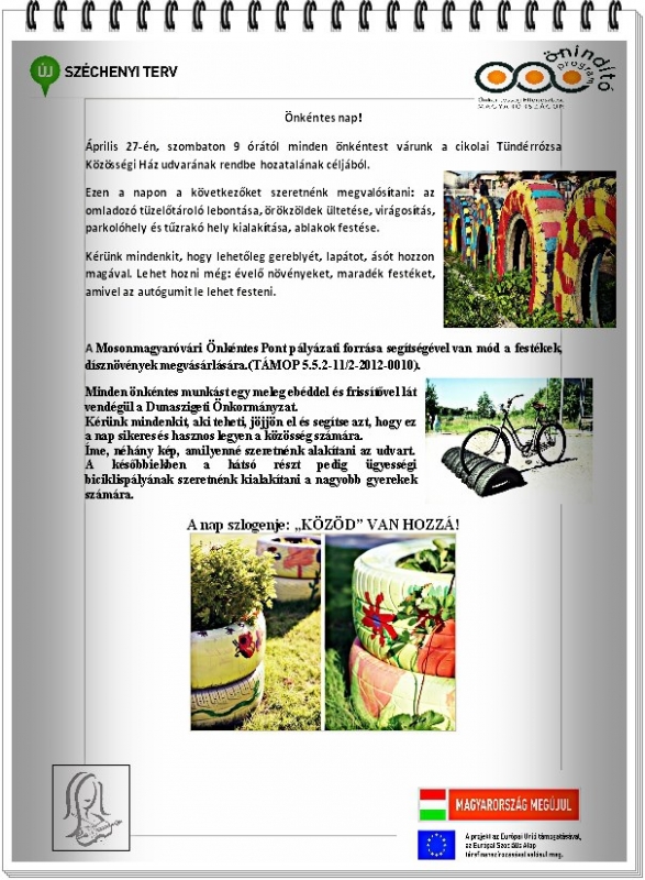 A segítőket reggel 9 órától várják a helyi közösségi ház udvarán. Elsődleges feladat, hogy az intézmény kertjét szebbé varázsolják, tűzrakó helyet alakítsanak ki, virágokat ültessenek.