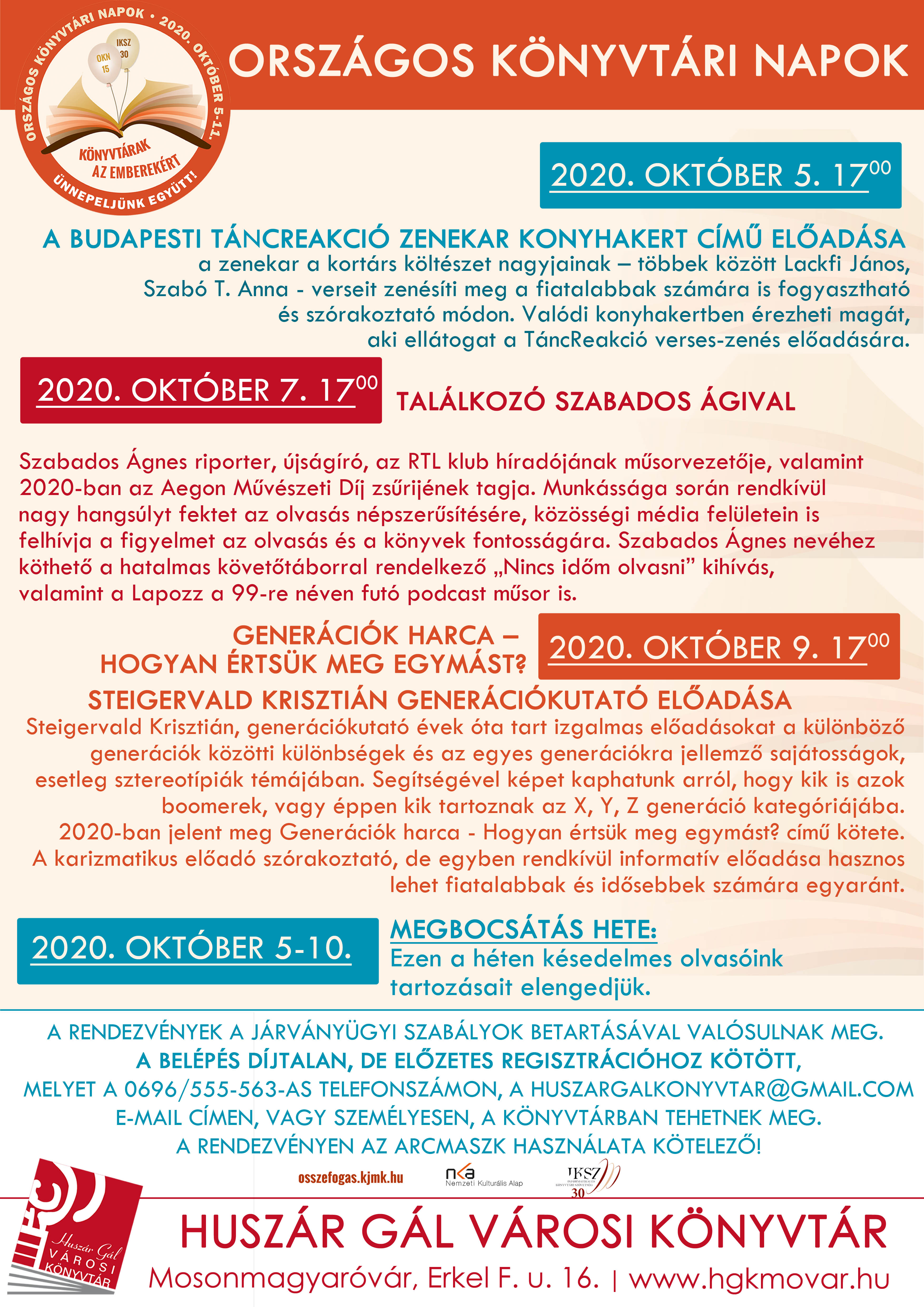 A rendezvénysorozat a járványügyi szabályok betartásával valósul meg. A programokon való részvétel előzetes regisztrációhoz kötött, melyet a 0696/555-563-as telefonszámon, a huszargalkonyvtar@gmail.com e-mail címen, vagy személyesen, a könyvtárban tehetnek meg. A rendezvényeken az arcmaszk használata kötelező.