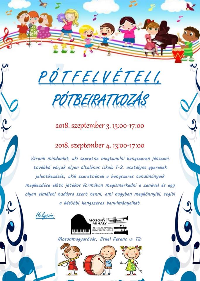 A Mosonyi Mihály Zenei Alapfokú Művészeti Iskola szeptember 3-án és 4-én 13.00 - 17.00 óráig várja a zenekedvelő diákokat és szüleiket pótbeiratkozásra. Még van pár szabad hely a 2018/2019-es tanévre!
