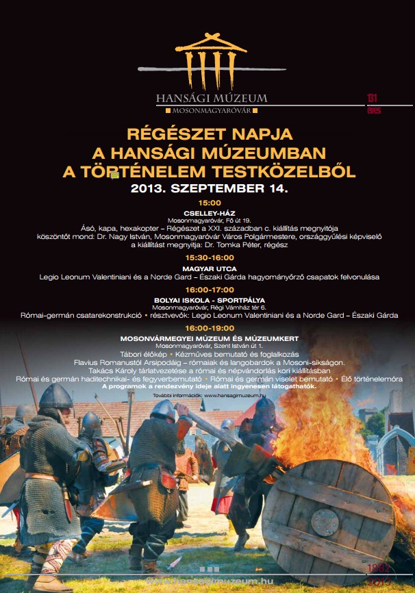 Különleges vállalkozásba fogott a Hansági Múzeum: életre kelti és testközelbe hozza a történelmet mindazoknak, akik szeptember 14-én 15:00 órától ellátogatnak a régészet napi rendezvényekre. A programsorozat egy izgalmas korszakot idéz meg, a római birodalom végnapjait, amikor új népek tűntek fel a történelem színpadán s a római légiók vad germán törzsekkel csaptak össze.